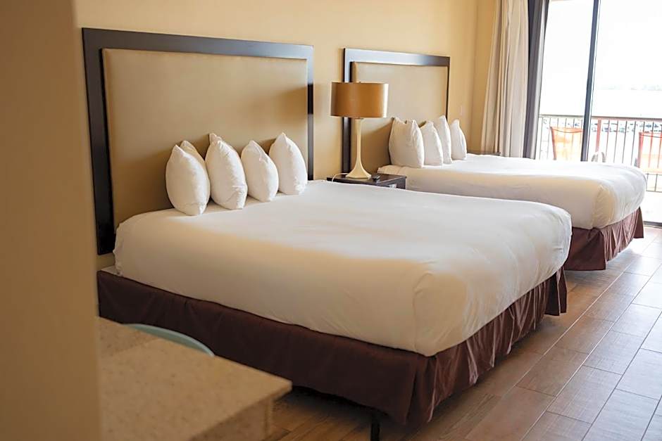 The hotel offers a variety of rooms, including Deluxe King, Studio with King Bed and Sofabed, Lake View, and King Rooms with Balcony, all non-smoking. The rooms accommodate 2 adults and 1 child, with bed sizes ranging from King to Queen. The largest option is the Two Bedroom Suite with balcony, spanning 1496 sqft and accommodating 6 adults and 5 children with a mix of Queen beds, King beds, and a Sofa Bed.