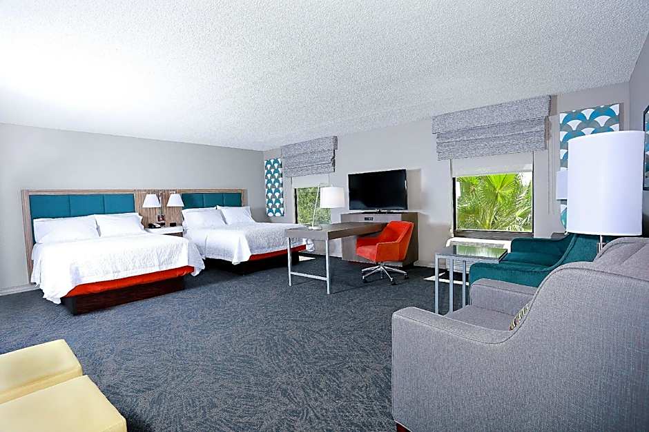 Sofa bed, HDTV, work desk, microwave, refrigerator, coffeemaker, free WiFi access Enjoy a restful stay in this spacious studio suite with two queen-sized clean and fresh Hampton beds®, a sofa bed and an LCD TV with HD channels. Additional amenities include a large work desk, a microwave, mini-refrigerator and a coffeemaker. Free WiFi access will help you to stay connected when on the road. The bathroom contains plush towels and a shower featuring a curved shower rod for added space and light.