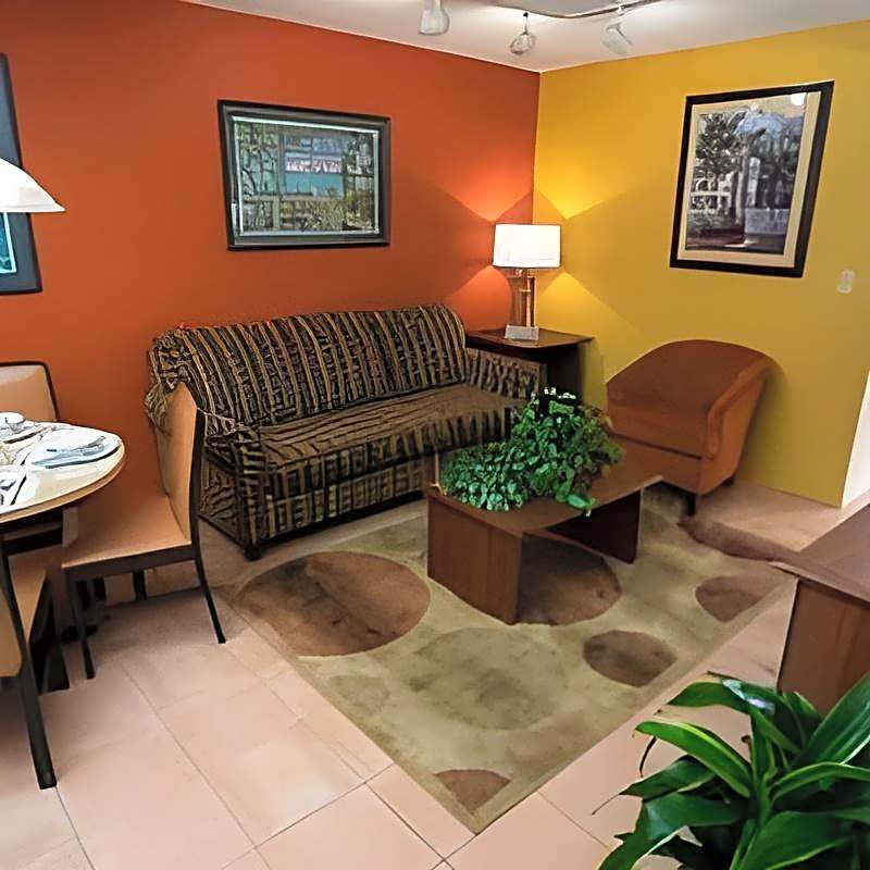 This suite features a microwave, refrigerator, and a dining area. An oven and stovetop are provided.