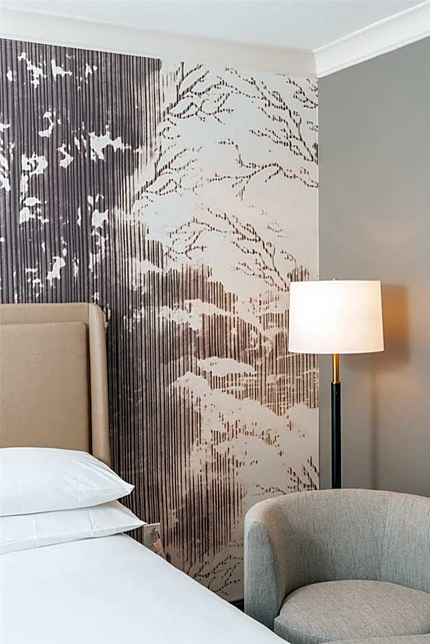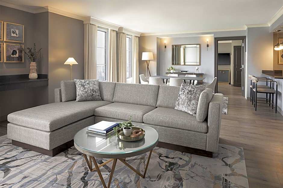 Indulge in this corner room's 450 square feet, with one king bed, wide city views, marble bath with vanity mirror, separate sitting area, spacious work area with ergonomic chair, and bedside charging station equipped with extra USB ports.