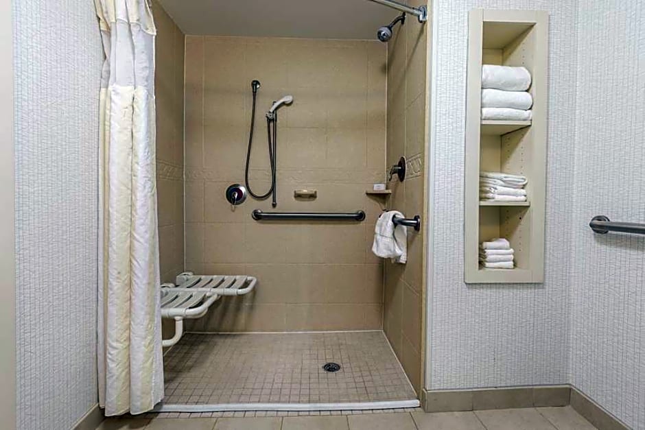 This mobility and hearing accessible standard room features one king-sized bed, and a 3 x 3 transfer shower. The room also has a visual alarm, and notification devices for the doorbell or door knock and incoming telephone calls. A 3 x 3 transfer shower with a built-in fold down seat with grab bars, plus a shower head that can be used as a handheld or fixed shower. The ergonomic Mirra chair by Herman Miller is good for your back and better for work. Enjoy your favorite television show on our 37 inch HDTV. There's also a microwave, refrigerator and coffee/tea maker to help you feel at home. And for conducting business, our rooms ensure your productivity thanks to the spacious work desk, telephone with dataport and voicemail and complimentary wired and WiFi access. Any corresponding photo may not reflect the specific accessible room type or room feature.