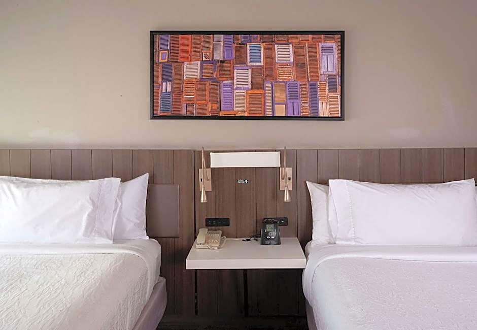 This newly renovated room features flat screen LCD TV with cable services, digital key lock system, microwave, refrigerator, Keurig coffee machine, complimentary Wi-Fi, built-in-wall blinds, and two queen sized bed with "his/hers" adjustable headboard reading lamps.
