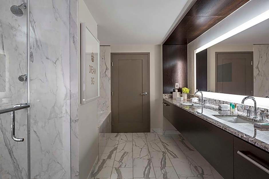 Beautiful and spacious room with really unique Atlanta-themed decor. There are USB charging ports near the bed, which is much appreciated. The little amenities in the room like toothpaste packets, cotton swabs, makeup remover, and coffee pods are nice touches.