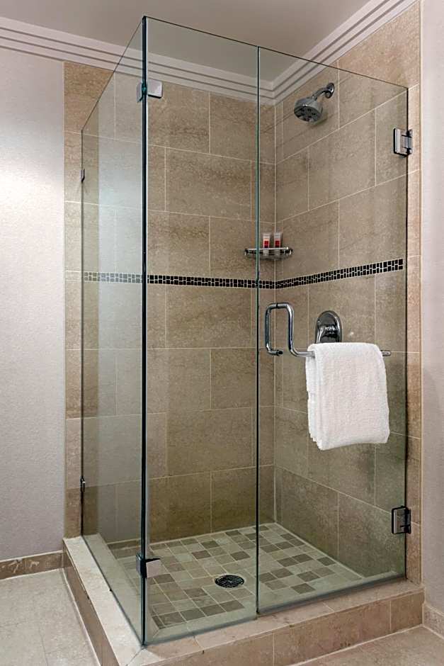 Featuring views of the Atlanta skyline through floor-to-ceiling windows, this room offers hearing-accessible amenities, including a visual alarm system and notification devices for the doorbell, door knock and incoming telephone calls.