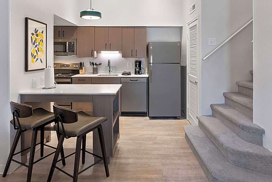 From 1 Queen bed and a full-size washer and dryer to accessible amenities like a roll-in shower, visual alarm, and notification devices for the doorbell/door knock and incoming phone calls, the non-smoking Studio Suite offers everything you need for a seamless stay. You’ll feel right at home thanks to a living area with a smart HDTV and sofa, along with a fully stocked kitchen with plates, silverware, cookware, granite countertops, a full-size refrigerator, dishwasher, microwave, full-range oven, pantry, coffee/tea maker, and kitchen island with stools. There’s also a spacious bathroom appointed with toiletries and a hair dryer. Included perks like free high-speed WiFi and premium satellite TV channels add extra convenience while natural light, bright décor, and plank-style flooring create a relaxing ambience. This suite also features ample closet and shelf space.