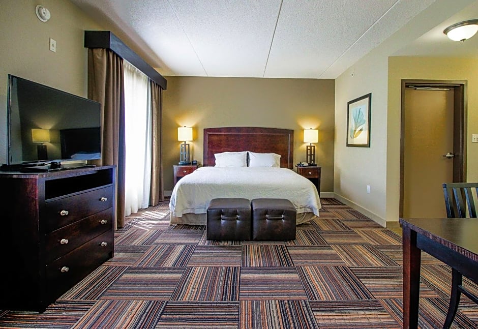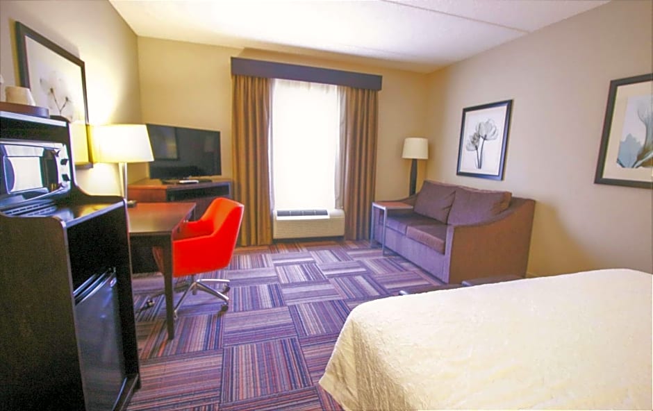 Any corresponding photo may not reflect the specific accessible room type or room feature. This hearing accessible, nonsmoking two-room suite features one king sized bed(s). The room also has a visual alarm and notification devices for the doorbell or door knock and incoming phone calls. The room features our luxurious Clean and Fresh Hampton Bed, comfortable sofabed, microwave, refrigerator, wet bar, a HDTV, and easy to operate alarm clock/radio. In the bath you will enjoy a WaterPik shower head and curved shower rod. The free high speed internet access will help you stay connected while on the road. If you prefer not to work at the desk, you can use the convenient lapdesk instead. You'll also enjoy the convenience of having a coffee maker with tea service and iron/ironing board in your room.