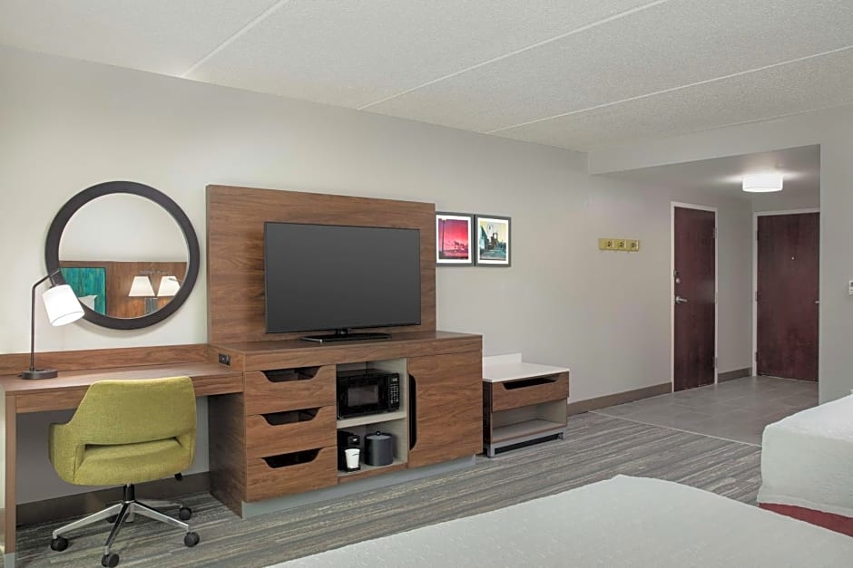 Microwave, refrigerator, desk, 32-inch TV, free WiFi Relax in this double queen room with two clean and fresh Hampton beds®. Watch movies on the 32-inch HDTV or surf the web with free WiFi. Catch up with work at the large desk with ergonomic chair. Refresh your senses in the bathroom, complete with shower and plush towels. Enjoy the convenience of having a microwave, refrigerator and coffeemaker in the room. Sleeps 4.