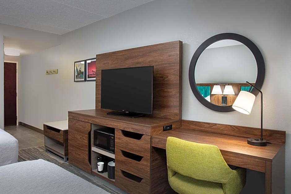 This hearing accessible, non-smoking room features one king-sized bed. The room also has a visual alarm and notification devices for the doorbell or door knock and incoming phone calls. The room features our clean and fresh Hampton bed, comfortable soft seating, microwave, refrigerator, a HDTV, and easy to operate alarm clock/radio. In the bath you will enjoy a WaterPik showerhead and curved shower rod. The free WiFi will help you stay connected while on the road. If you prefer not to work at the desk, you can use the convenient lapdesk instead. You'll also enjoy the convenience of having a coffeemaker with tea service and iron/ironing board in your room. Any corresponding photo may not reflect the specific accessible room type or room feature.