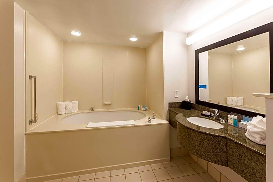 Whirlpool, 42-inch HDTV, whirlpool, free WiFi, coffeemaker Relax in this spacious Deluxe Room and enjoy a range of convenient features. Rejuvenate in the whirlpool or relax in front of the 42-inch HDTV. Stay on top of business at the desk and keep up-to-date with free WiFi. Experience a restful night in a king clean and fresh Hampton bed®. Savor a freshly brewed coffee from the coffeemaker. The bathroom includes a shower with a curved rod; allowing for more space. Pamper yourself with plush towels.