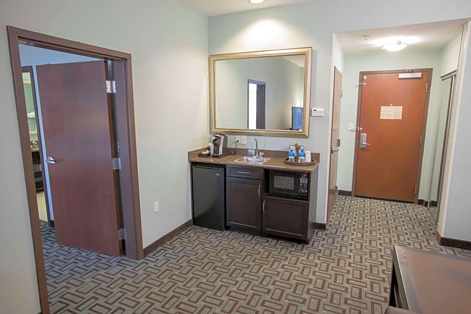 This spacious elegant suite features one king-sized bed with a separate living and sleeping area. Enjoy your favorite television show on our 42-inch HDTV. There's also separate sitting area and hospitality center with a microwave, refrigerator and coffee/tea maker to help you feel at home. And for conducting business, our rooms ensure your productivity thanks to the oversized work desk with ergonomic chair, two telephones with dataport and voice mail and complimentary WiFi access.