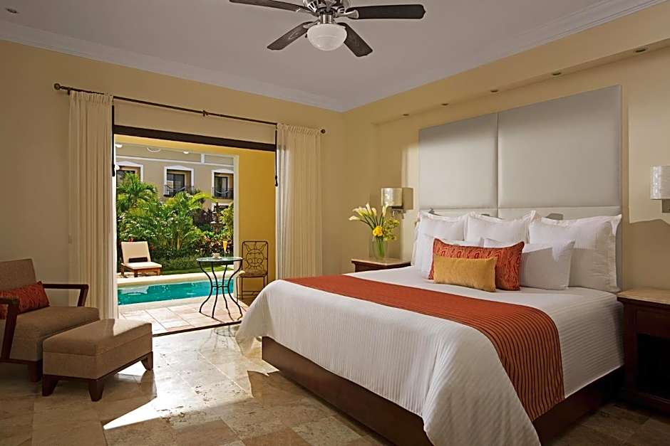 This room in the adults-only section features contemporary decor, king or two double beds, bathroom, double sink, private terrace and a beautiful direct swim-out access to a refreshing swimming pool that flows to each private patio. Built in the shape of old haciendas centering the garden and plaza with a fountain and benches creating a sense of old México. Bar service by the pools.