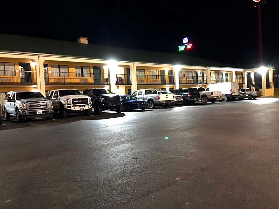 The parking at the front of the hotel was full and there was no access from the rear of the property where the remainder of the parking was located. Trucks were parked in the access road to the rear lot which was likely a fire lane.