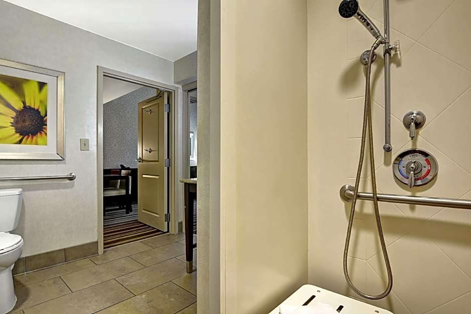 Our mobility accessible King Non-Smoking Suite includes a bedroom along with a separate living room tastefully furnished with a modern and refreshing color palette of Apple Green, Ivory & Chocolate with contemporary style furnishings including a work desk with ergonomic chair, sofa bed, armchair, wet bar with microwave, refrigerator, coffeemaker and a 32-inch LCD television. The bedroom is well appointed with the heavenly Suite Dreams bed matched with a striking upholstered headboard and 32-inch LCD television. This mobility accessible standard suite features a roll-in shower and a granite vanity. As with all of our suites, included is a full cooked-to-order breakfast and our complimentary Evening Reception. Each suite, as well as our lobby area, is equipped with complimentary wired or WiFi access. Any corresponding photo may not reflect the specific accessible room type or room feature.