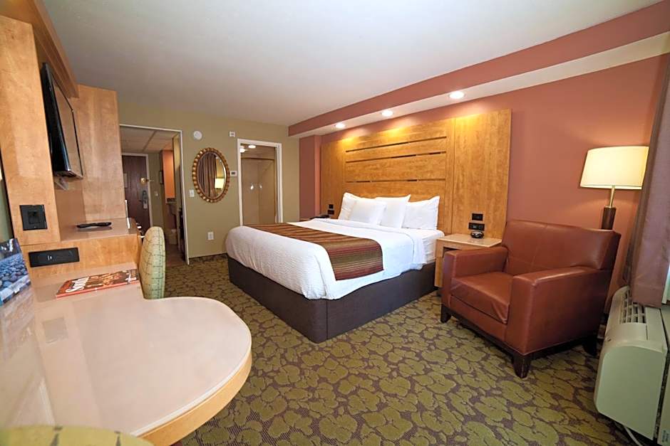 This accessible room features a cable TV, microwave, and roll-in shower with handrails. A lower sink basin and large walkways are also included.