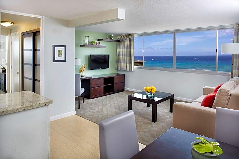 Featuring a separate living area, this air-conditioned room includes views of Waikiki from its spacious balcony, and a flat-screen TV, DVD Movies and Rentals to DVD players. A kitchenette with granite countertops, refrigerator and a 2-burner stove top is also included.