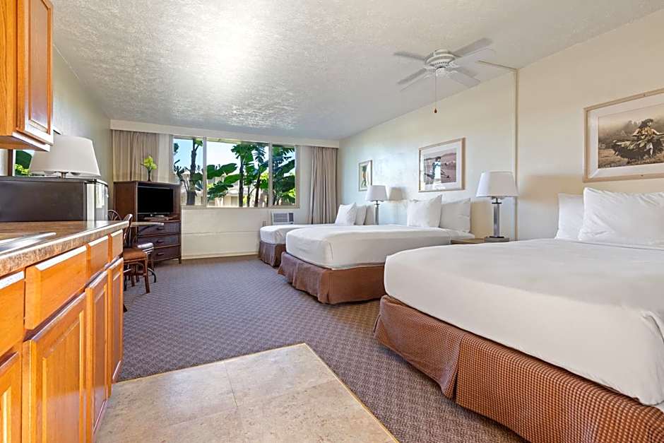Our Superior Rooms feature views of Maui’s tropical gardens and include your choice of 2 double beds or 1 king, featuring triple sheeting. All Superior Rooms are equipped with a flat screen TV, A/C, ceiling fan, private bathroom, hair dryer, direct dial phone, radio and alarm clock. Maximum occupancy is 3 people (there is a charge for third person). We do not charge a resort fee.