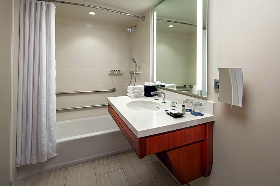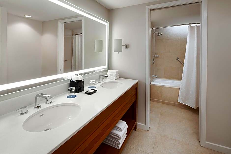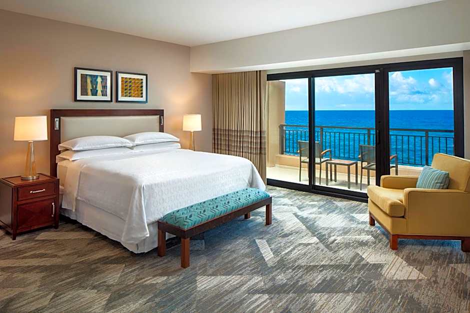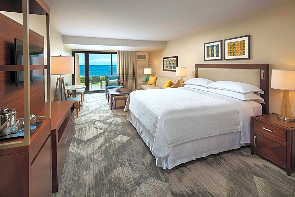 At the Sheraton Kauai Resort, guests can choose from Deluxe Oceanfront rooms with 1 King bed, offering stunning ocean views. These rooms have a size of 506 sqft and are non-smoking. Each room can accommodate 2 adults and 1 child. The hotel also provides a Double room option with a King bed specifically designed for guests with accessibility needs, featuring a mobility accessible adapted tub.