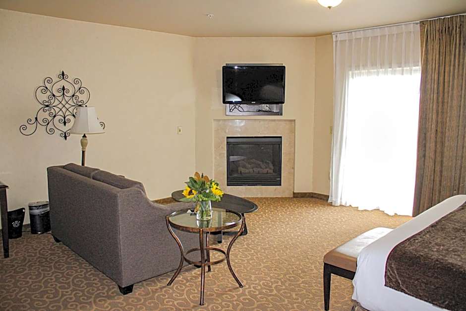 Offering the Oxford Suites signature premium bedding package, this room includes a sofa bed, a TV, and a kitchenette. Additional amenities include a soaking tub, a gas fireplace, a balcony, WiFi, and wired internet access.