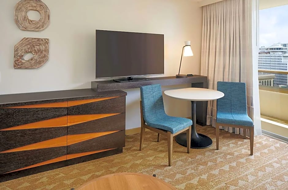 This suite includes a living room, kitchenette and a patio with a hot tub.
