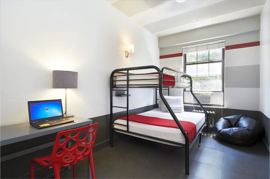 Single twin bed in coed, bunk bed style dormitory room, with one locker per bed; guest must have own lock. Bedding and towels provided. Room has air conditioning in summer, radiator heat in winter. Shared communal bathrooms with private shower stalls, toilets, and sinks conveniently located on every floor.