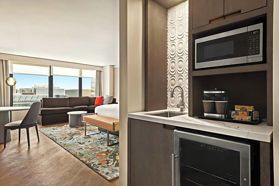 Location of hotel was excellent - close to Lake Michigan / Navy Pier, Michigan Ave / Magnificent Mile, many restaurants within walking distance, plus there was a grocery store right next door. One bedroom suite was spacious with nice furnishings, great TVs, a small kitchenette, and lots of space in the bathroom for toiletries and hanging damp towels. Elevator was prompt and free WiFi was speedy. Plenty of comfortable seating in the lobby also. The texting system for checking on guests was friendly and very responsive when a problem was reported.