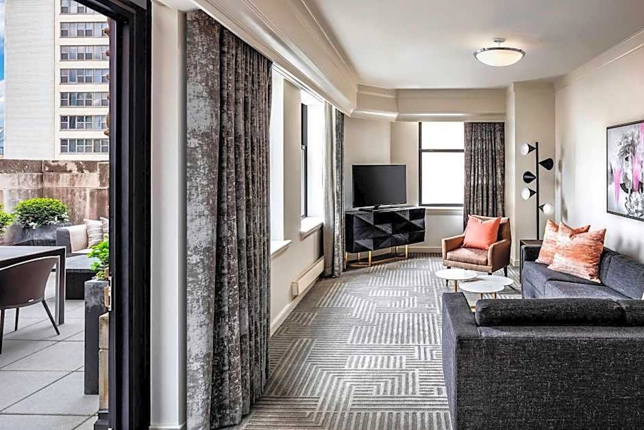 Guests at The Gwen, a Luxury Collection Hotel, can enjoy their time by utilizing the various leisure amenities offered. They can start their day by working out at the fitness center or enjoying a refreshing drink at the bar. The hotel also has a sun deck where guests can relax and soak up the sun.