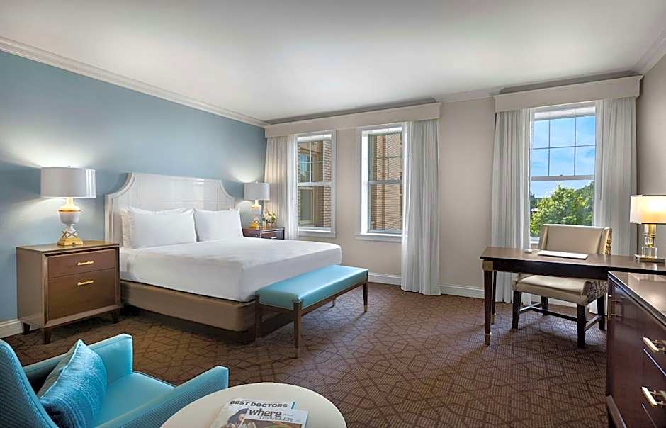 The Royal Sonesta Chase Park Plaza St Louis offers a range of room options including Queen Rooms, King Rooms, and Double Rooms. The rooms are non-smoking and accommodate 2 adults and 1 child. Bed sizes vary between Queen size and King size. Additionally, the hotel offers One-Bedroom Queen Suites, One-Bedroom King Suites, and a mobility/hearing accessible One Bedroom Suite with a King bed. These suites are larger in size and can accommodate 3 adults and 2 children.