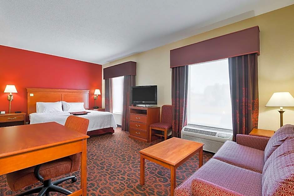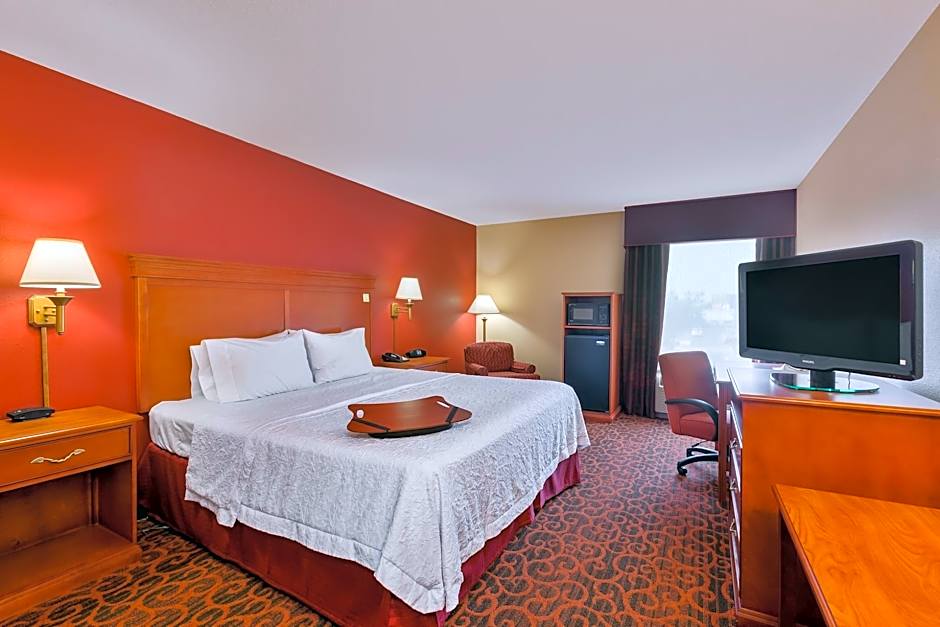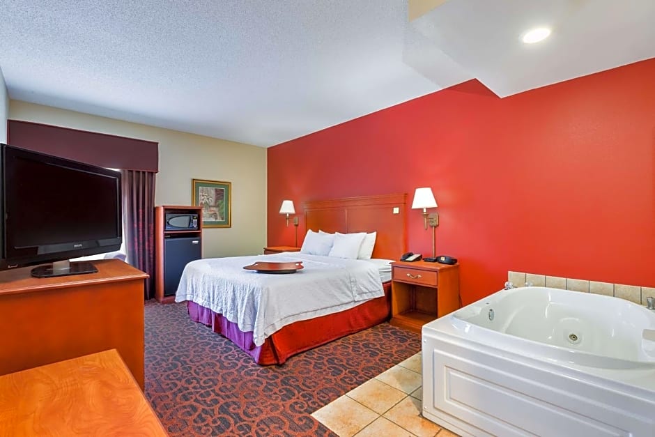 Whirlpool, free WiFi, 32-inch TV, easy chair with ottoman, work desk, coffeemaker, shower This spacious non-smoking guest room features our king-sized clean and fresh Hampton bed®, a comfortable easy chair with ottoman, and a 32-inch TV. Catch up on work at the large desk, or surf the web with free WiFi access. Refresh in the bathroom which has a WaterPik showerhead and curved shower rod that allows more light and space in the shower.