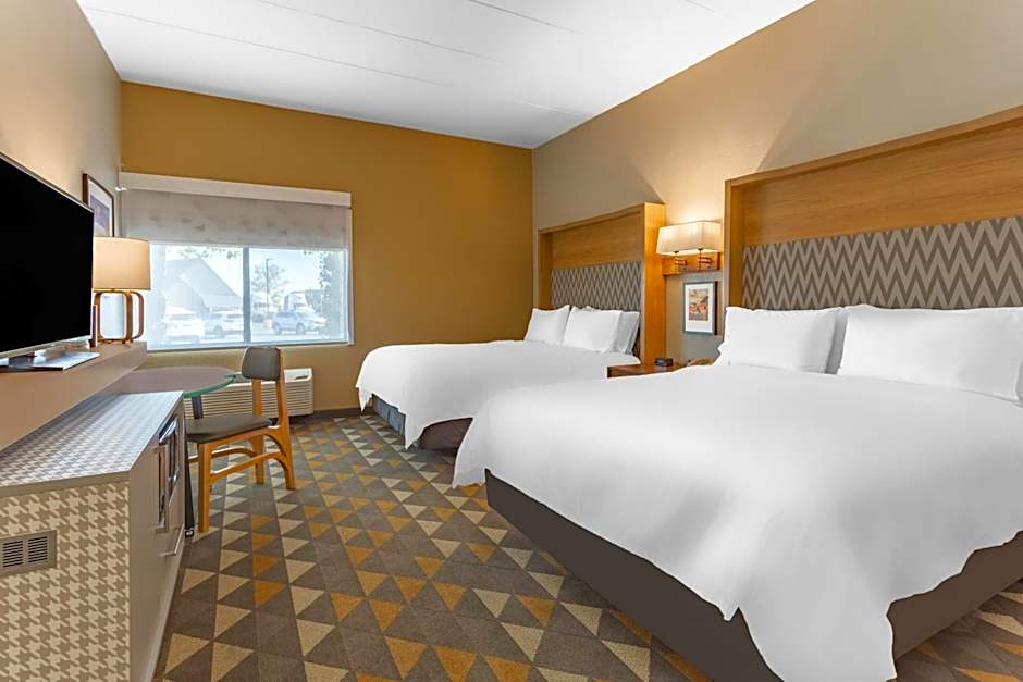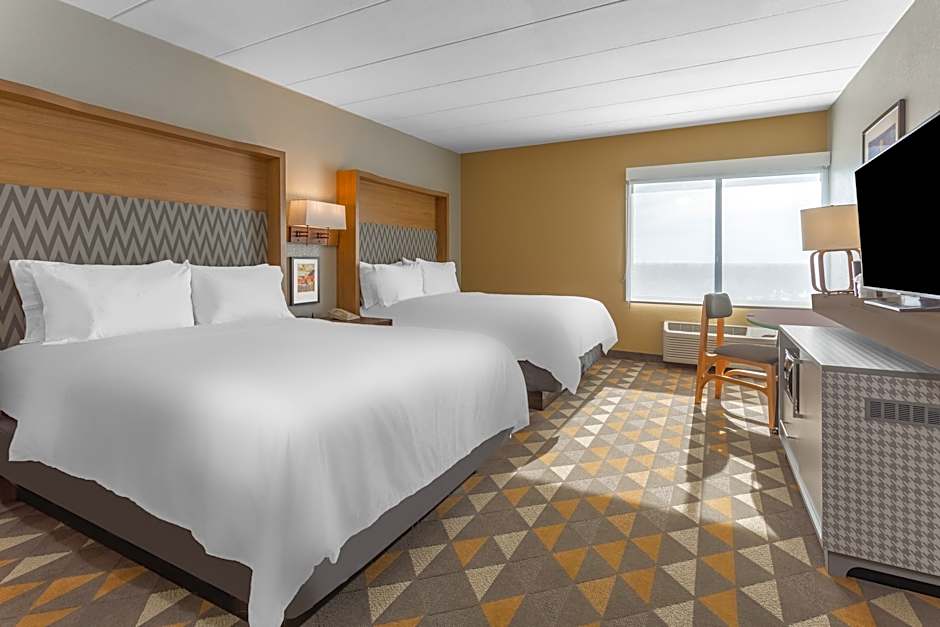 The Holiday Inn Rockford offers a variety of room types including King Rooms, Queen Rooms, Twin Rooms, and Suites. All rooms are non-smoking and have a similar size of 355 sqft, except for some suites which are larger at 495 sqft. The occupancy ranges from 2 adults and 1 child for the regular King Room, to 4 adults and 3 children for the mobility access rooms and suites. Bed sizes include King, Queen, and Twin beds, depending on the room type chosen.