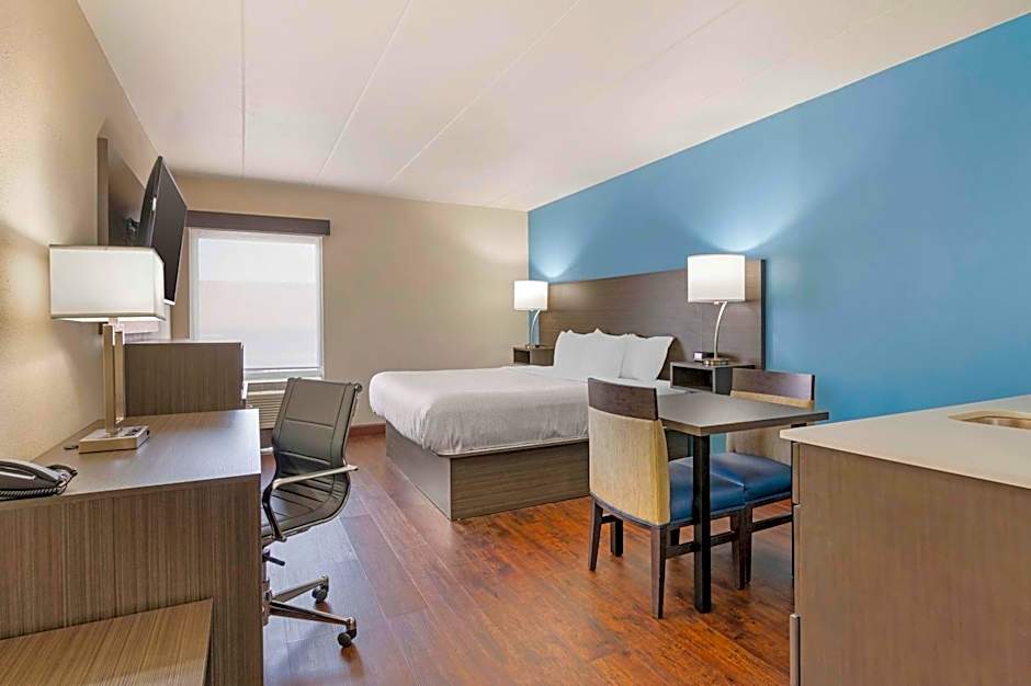 The hotel offers a variety of room types including King Rooms with Bathtub or Shower Only, King Rooms with Kitchenette, Queen Rooms with Two Queen Beds and Shower Only or Bathtub, as well as a King Room with Whirlpool. All rooms are non-smoking and have a bed size of either King or Queen. The rooms can accommodate either 2 adults or 4 adults, with no children.