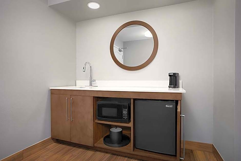 This mobility and hearing accessible, non-smoking room features one king-sized bed, and an accessible bath tub. The room also has a visual alarm and notification devices for the doorbell or door knock and incoming phone calls. The room features comfortable soft seating, microwave, refrigerator, a HDTV, and easy to operate alarm clock/radio. The free WiFi will help you stay connected while on the road. If you prefer not to work at the desk, you can use the convenient lapdesk instead. You'll also enjoy the convenience of having a coffeemaker with tea service and iron/ironing board in your room. Any corresponding photo may not reflect the specific accessible room type or room feature.