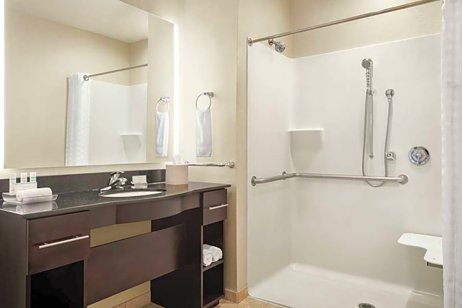 This mobility accessible non-smoking one bedroom suite features one king-sized bed and an accessible bathtub. This suite has a kitchen, built to lower scale, is fully equipped down to utensils, and includes a full-sized refrigerator, microwave, dishwasher and twin burner stove. The dining area can easily double as workspace. This suite provides a private bedroom with a HDTV and a separate living area features a full-sized sofa bed, chair and HDTV. All of our suites keep you connected with complimentary high-speed internet access, telephone, and alarm clock with MP3 player capabilities and pre-set local radio stations. Any corresponding photo may not reflect the specific accessible room type or room feature.