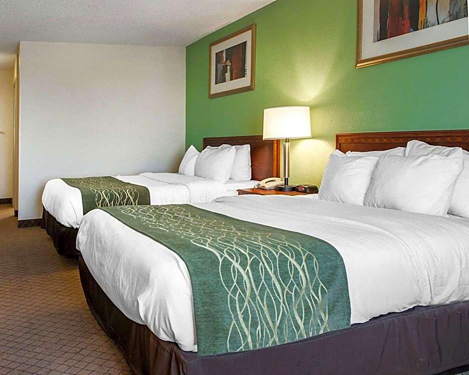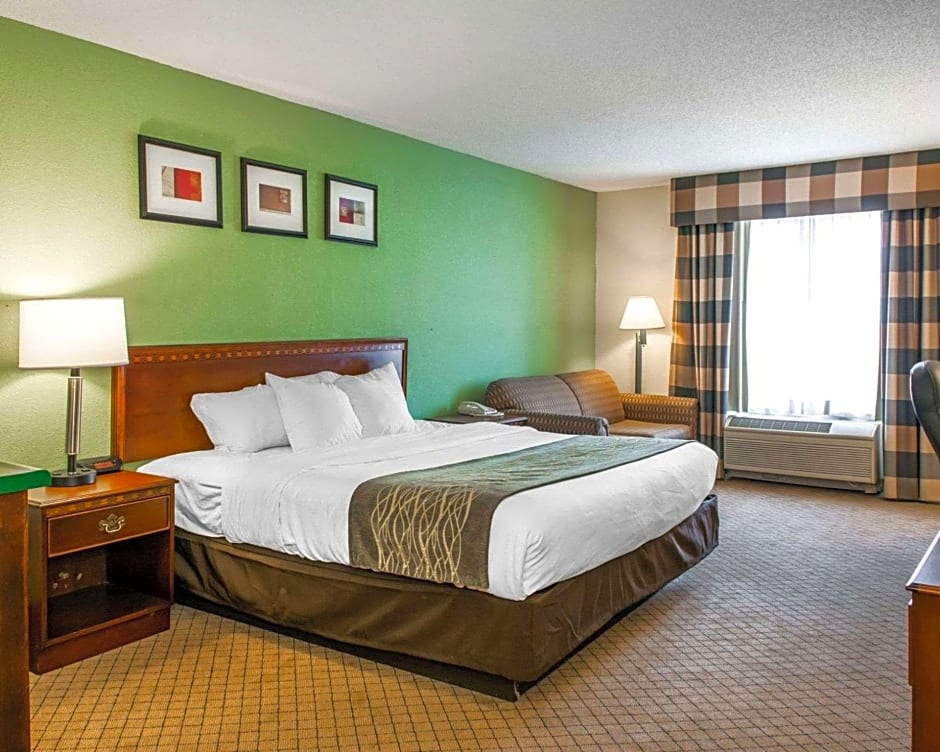 The Comfort Inn Goshen offers a variety of room types, including Double rooms with two queen beds and King rooms with either one king bed or two queen beds. The occupancy ranges from 2 adults and 1 child to 4 adults and 3 children. All rooms are non-smoking, and the bed sizes range from queen to king, with room sizes averaging 334 sqft for the different room types.