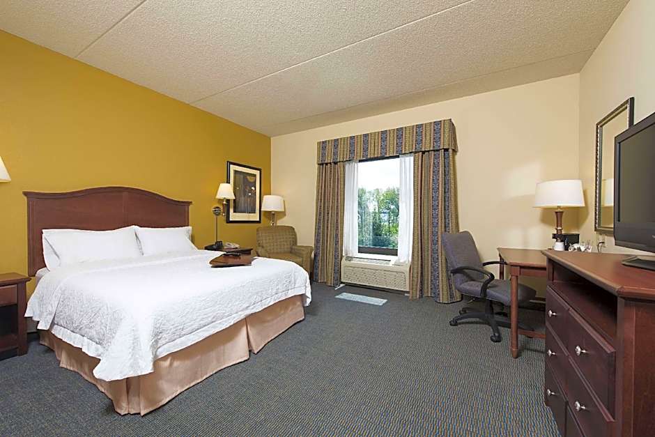 Easy chair, desk, 32-inch TV, free WiFi Relax in this king room with a clean and fresh Hampton bed®. Sink into the easy chair with ottoman and watch movies on the 32-inch HDTV. Surf the web with free WiFi. Catch up with work at the large desk with ergonomic chair. Refresh your senses in the bathroom, complete with shower only and plush towels. Enjoy the convenience of having a coffeemaker in the room.