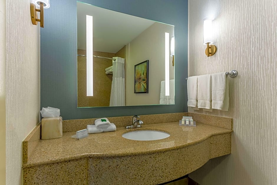 This mobility and hearing accessible standard room features one king bed, and an accessible tub. The room also has a visual alarm, and notification devices for the doorbell or door knock and incoming telephone calls. Grab bar in tub with attached accessible seating, lowered vanity in bathroom, and lowered closet shelf. The ergonomic chair is good for your back and better for work. Enjoy your favorite television show on our 36-inch HDTV. There's also a microwave, refrigerator and coffee/tea maker to help you feel at home. And for conducting business, our rooms ensure your productivity thanks to the spacious work desk, complimentary WiFi access, two telephones with dataport and voicemail. Any corresponding photo may not reflect the specific accessible room type or room feature.