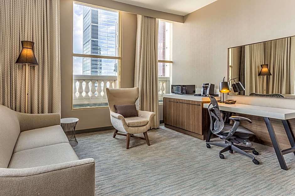 Work desk & ergonomic chair, 37-inch LCD TV, microwave, refrigerator, complimentary WiFi Enjoy space and comfort in this bright guest room with 12-foot ceilings and warm décor. Catch up on business at the spacious work desk with an ergonomic chair and stay connected with complimentary WiFi. The room also includes a 37-inch LCD TV with expanded channels, plus a refrigerator, a microwave and a Keurig® coffeemaker. Relax in the bathroom which offers granite surfaces, a curved shower rod and heated mirrors.