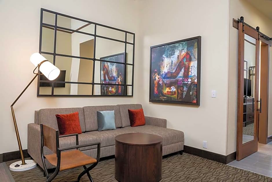 This mobility accessible non-smoking studio suite features one king-sized bed, and an accessible bathtub. This suite has a kitchen built to lower scale with full-sized refrigerator, microwave, dishwasher and twin burner stove - plus utensils - to make dining in easy. For added convenience and flexibility, there is a HDTV, a full-sized sofa bed as well as an additional work table and chair, separate from the dining area table. This suite will keep you connected with complimentary high-speed internet access, telephone, and alarm clock with MP3 player capabilities and preset local radio stations. Any corresponding photo may not reflect the specific accessible room type or room feature.