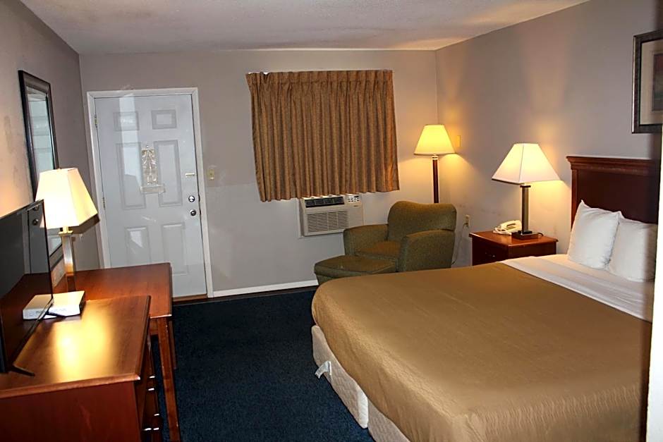 Inexpensive and right off the interstate. My daughter and I swung in during a road trip. VERY clean, updated bathroom, fridge and microwave, nice staff, cold AC. All you need.