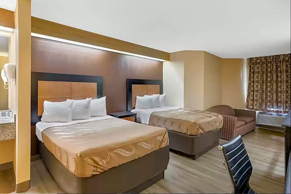 Comfortable family guest room with 2 Queen Beds and 2 full beds bunk bed. Non-Smoking. Amenities include free wireless high-speed Internet access, microwave, mini-fridge, coffeemaker, hairdryer, 32 inch flat panel cable TV, HBO, ESPN, iron, ironing board, table with chairs, alarm clock radio, free local calls, and wake-up service. Free grab-n-go breakfast is included.