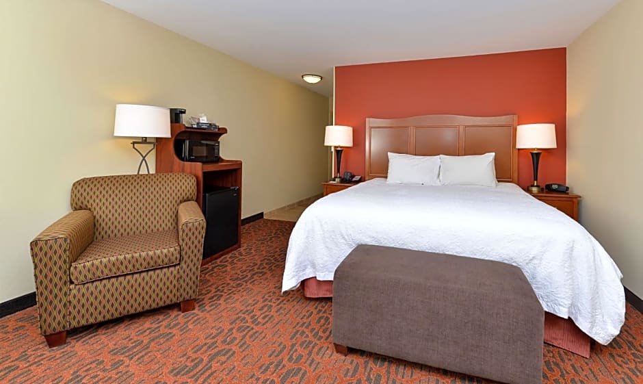 Hearing Accessible, Microwave, Mini-Fridge, 32-inch HDTV Sleep well in this king hearing accessible room that features our clean and fresh Hampton bed®. This room is equipped with a visual doorbell and visual telephone alert. Catch up on your favorite TV show with our 32-inch HDTV. Enjoy a hot drink from your in-room tea/coffee maker. The room includes a microwave and mini-fridge to store your favorite late night snacks. The room also has a spacious work desk and free WiFi to let you catch up on work while traveling. In the bathroom you'll enjoy our fluffy towels, a WaterPik® showerhead and curved shower rod for added space and light.