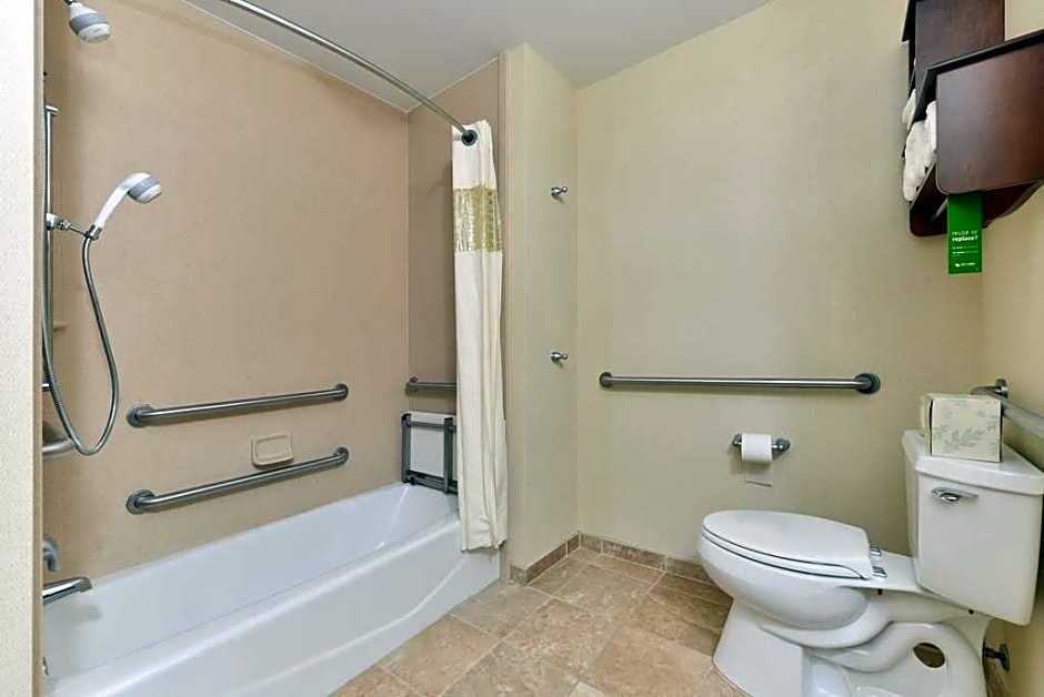 Hearing and Mobile Accessible with Roll-In Shower, Microwave, Mini-Fridge Enjoy your stay in this queen room with hearing and mobile accessible roll-in shower that features 2 of our clean and fresh Hampton bed®. This room is equipped with a visual doorbell and visual telephone alert. Catch up on your favorite TV show with our 32-inch HDTV. Enjoy a hot drink from your in-room tea/coffee maker. The room includes a microwave and mini-fridge to store your favorite late night snacks. The room also has a spacious work desk and free WiFi to let you catch up on work while traveling. In the bathroom you'll enjoy our fluffy towels, a WaterPik® showerhead and curved shower rod for added space and light.