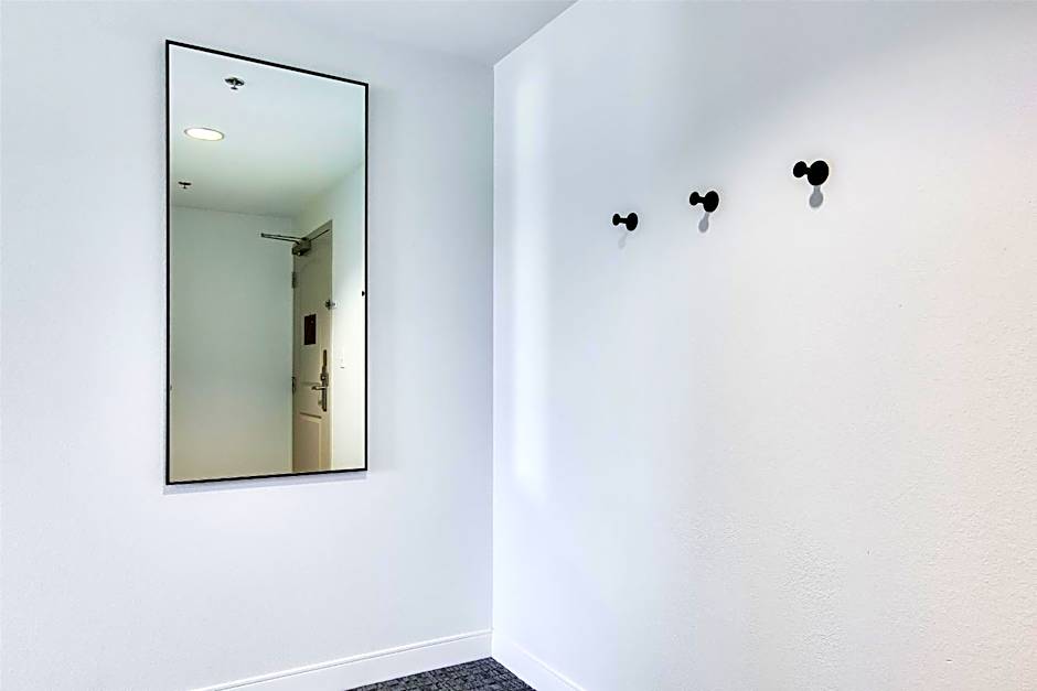 This suite includes a separate living room with a sofa bed and a full kitchen. It also includes a disability accessible bath tub.