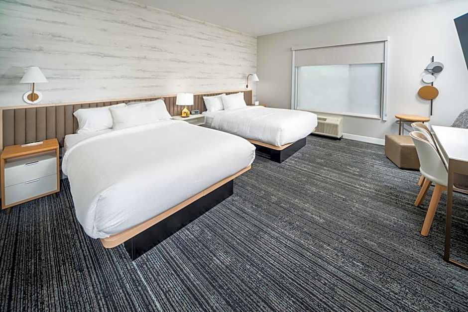 The hotel offers King Studios and Queen Studios. Both room types have non-smoking rooms available. The King Studios have a room size of 291 sqft and accommodate 3 adults with 1 King size bed, while the Queen Studios have a larger room size of 366 sqft and accommodate 4 adults with 2 Queen size beds. The hotel also offers hearing accessible options for both room types.