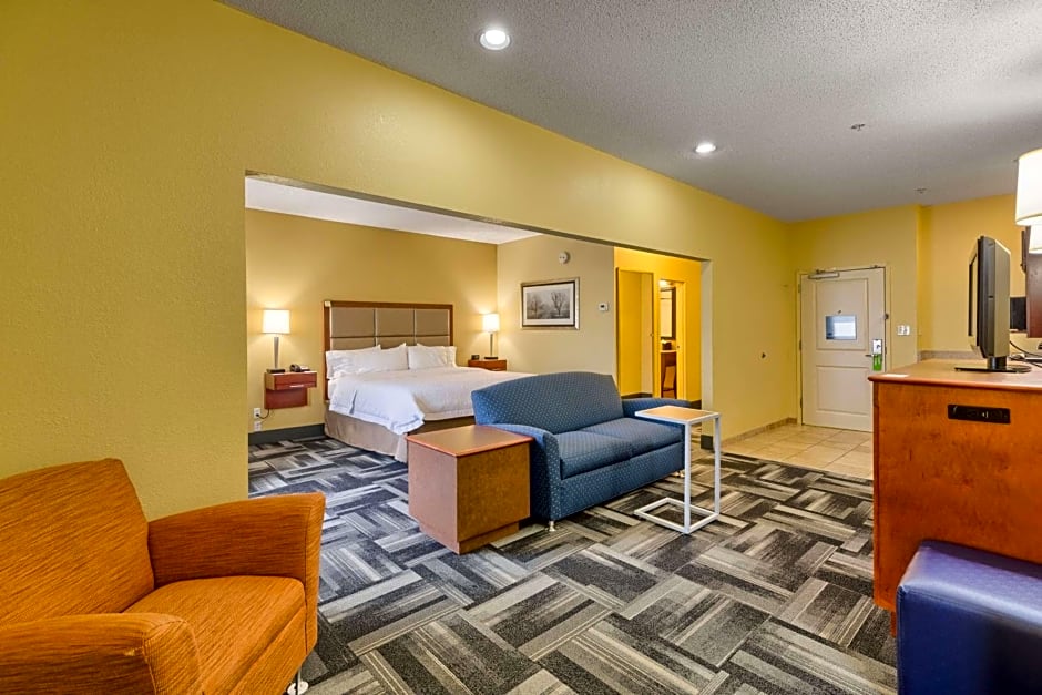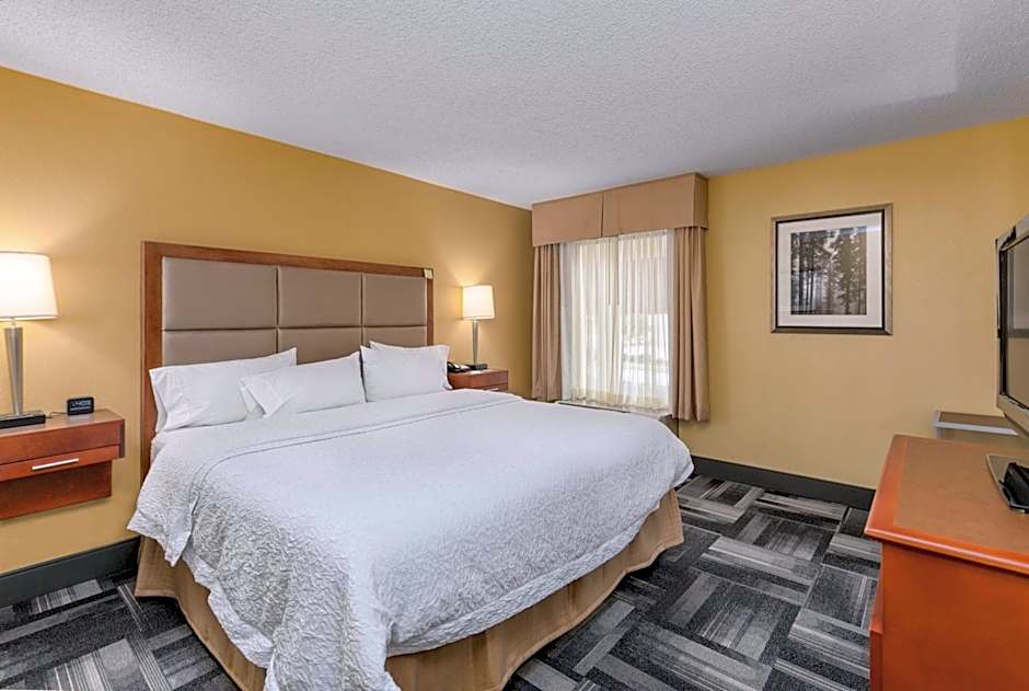 This hearing accessible, non-smoking room features one king-sized bed. The room also has a visual alarm and notification devices for the doorbell or door knock and incoming phone calls. The room features our clean and fresh Hampton bed®, comfortable sofa bed, microwave, refrigerator, a HDTV, and easy to operate alarm clock/radio. In the bath, you will enjoy a WaterPik shower head and curved shower rod. The free WiFi access will help you stay connected while on the road. If you prefer not to work at the desk, you can use the convenient lap desk instead. You'll also enjoy the convenience of having a coffeemaker with tea service and iron/ironing board in your room. Any corresponding photo may not reflect the specific accessible room type or room feature.