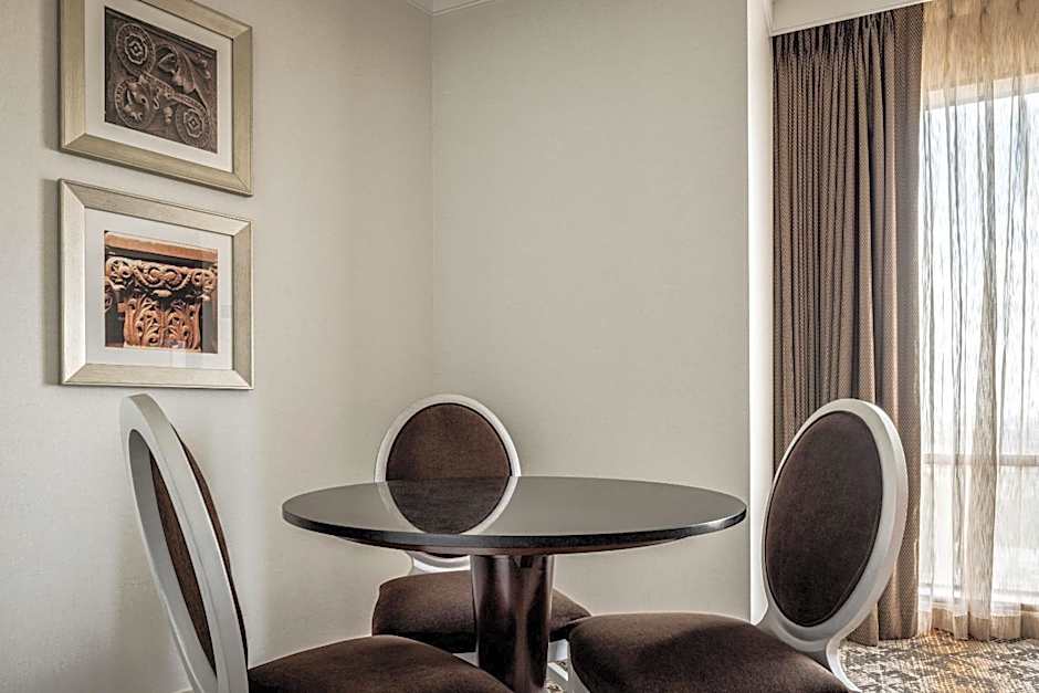 Fitted with darkwood furnishings, this room also provides fine beddings, a TV and an oversize marble bathtub. It features views of surrounding area.