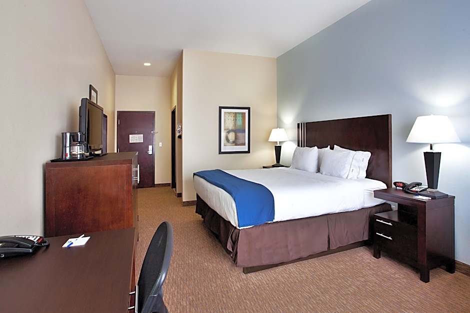 The Holiday Inn Express - Eunice offers various types of rooms, including Leisure King Rooms, Queen Rooms with Two Queen Beds, and King Suites. All rooms are non-smoking and have different bed sizes (King or Queen) to accommodate different numbers of guests (2 adults and 1 child, or 4 adults and 3 children). Some rooms also have specific features like mobility access tubs or hearing accessibility.