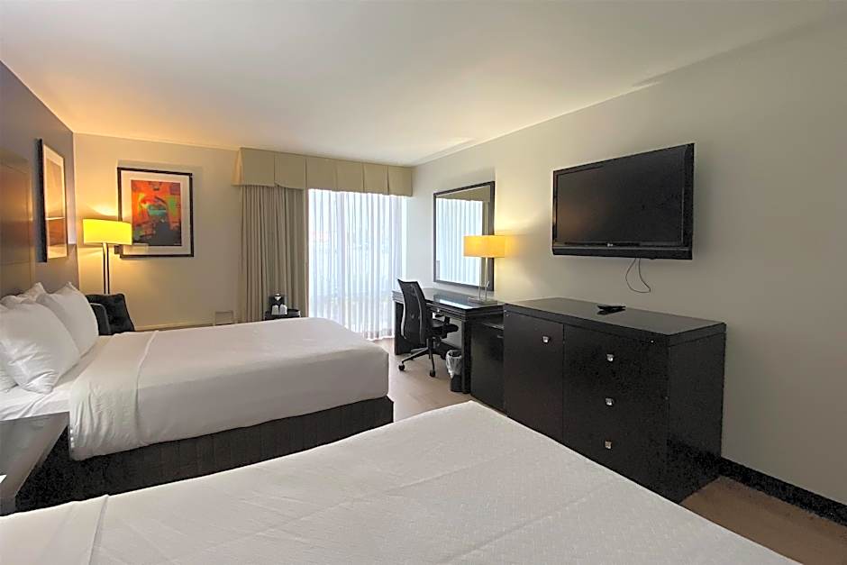 Two Queen Beds, Flat Screen TV, Premium Pool View, Desk with Chair, Refrigerator and Wi-Fi.