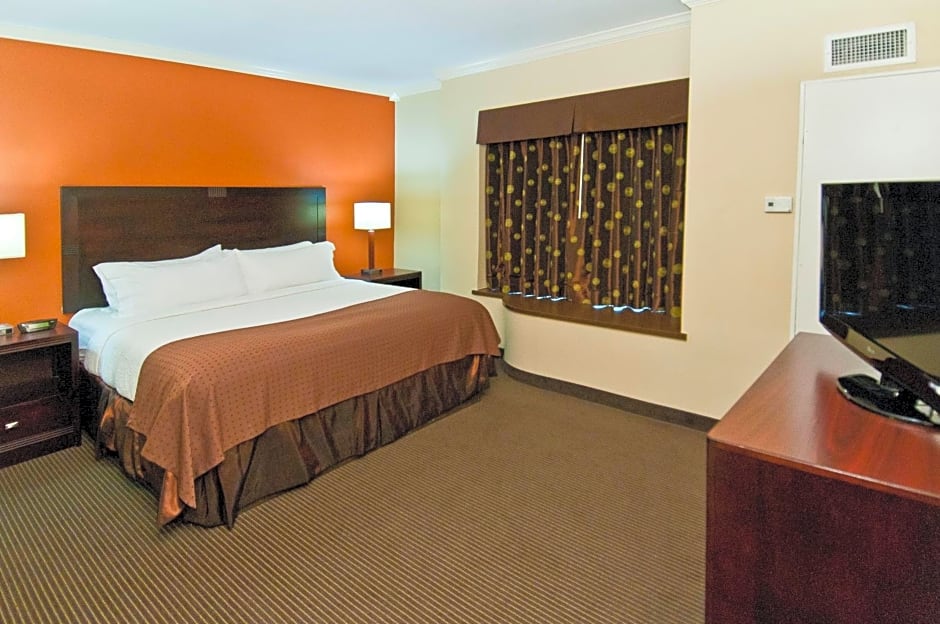 The Holiday Inn Hotel & Suites Lake Charles South offers a variety of room types including King Suites, Executive King Rooms, King Rooms (non-smoking), Double or Twin Rooms, Queen Rooms with Two Queen Beds, and Executive Queen Rooms with Two Queen Beds (non-smoking). All rooms are non-smoking and have an occupancy range from 2 adults and 1 child to 4 adults and 3 children. Bed sizes range from 1 King bed to 2 Queen beds. The room sizes are all 205 sqft, except for the King Suite which is 301 sqft.
