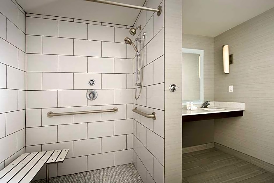 This mobility accessible suite has a kitchenette with full-sized refrigerator and dishwasher. The equipped kitchen has been lowered for accessibility. This suite includes a sofa bed and desk with chair. Guests can enjoy a flat-screen TV with cable.