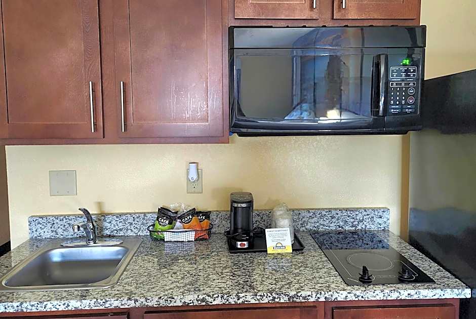 Featuring a kitchenette with microwave, this room offers a flat-screen cable TV, work desk and refrigerator.